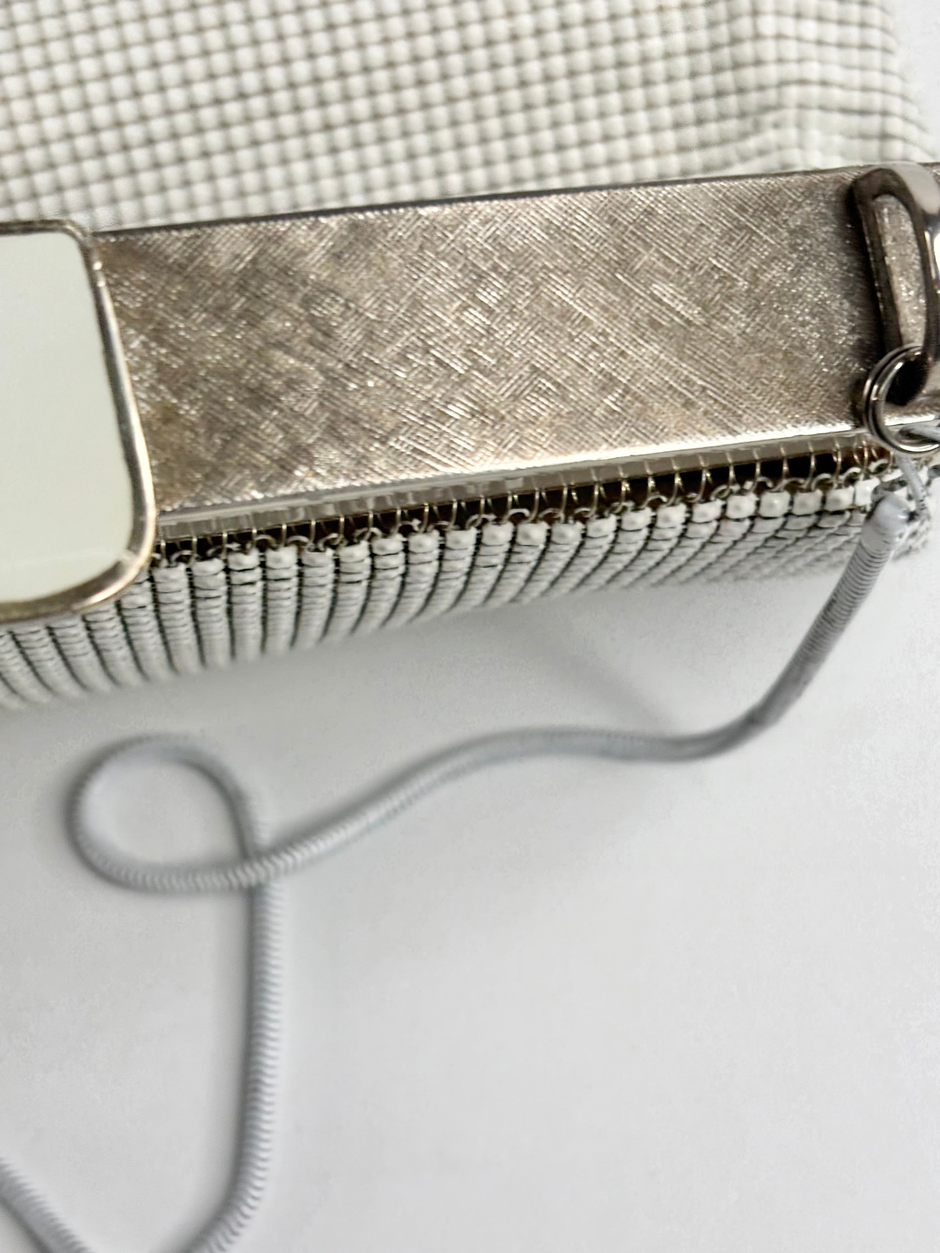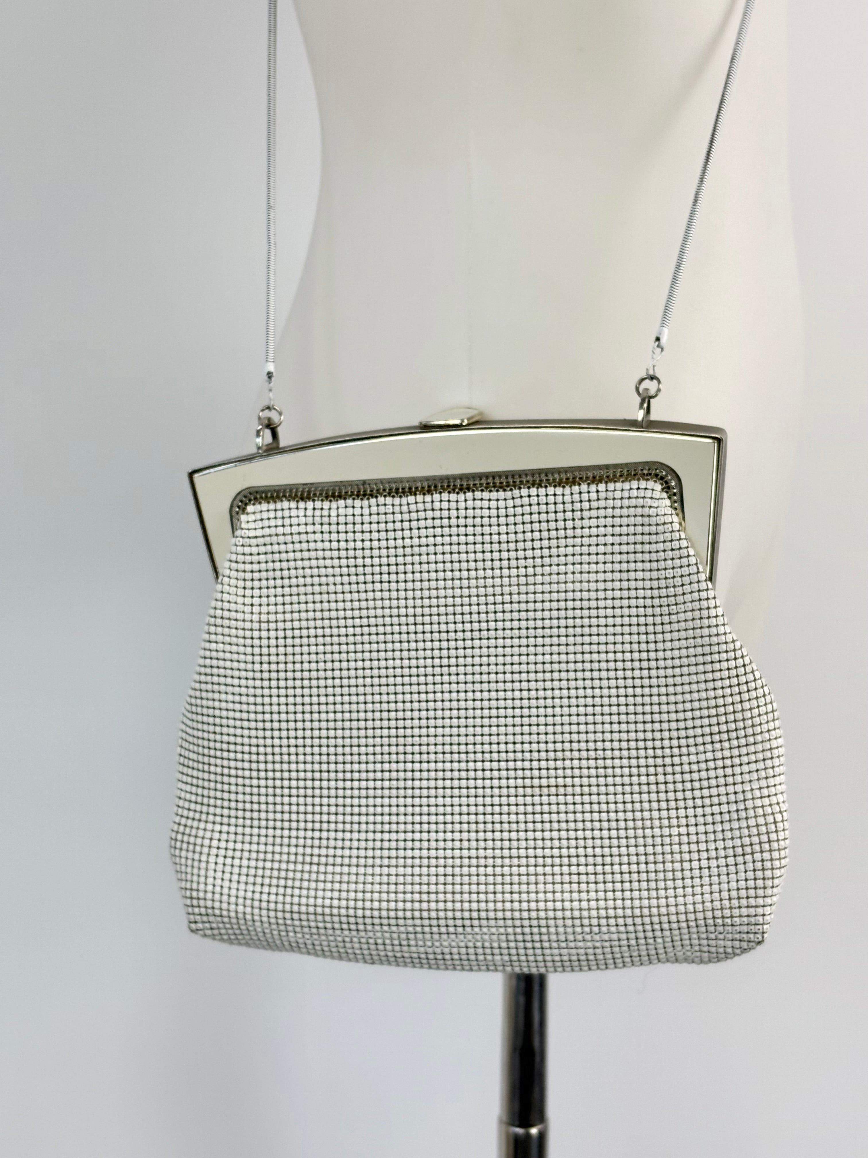The timeless and iconic glomesh evening, with that pearly white finish and satin fabric lining. It presents in very good condition overall, though as pictured there is marks and wear throughout the inner lining.