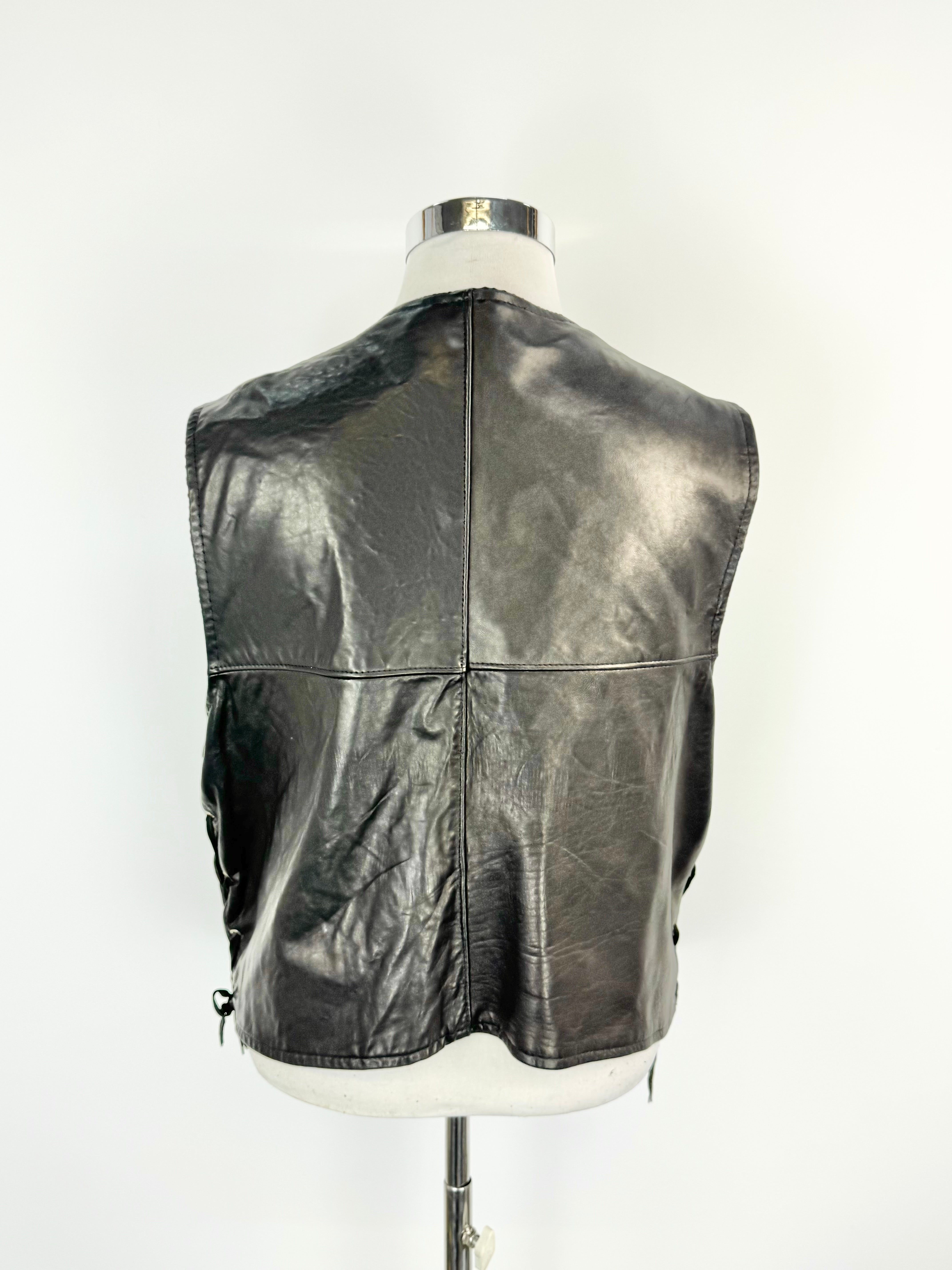 A black leather vest fully lined in a polyester fabric with lots of patches embroidered on the front.