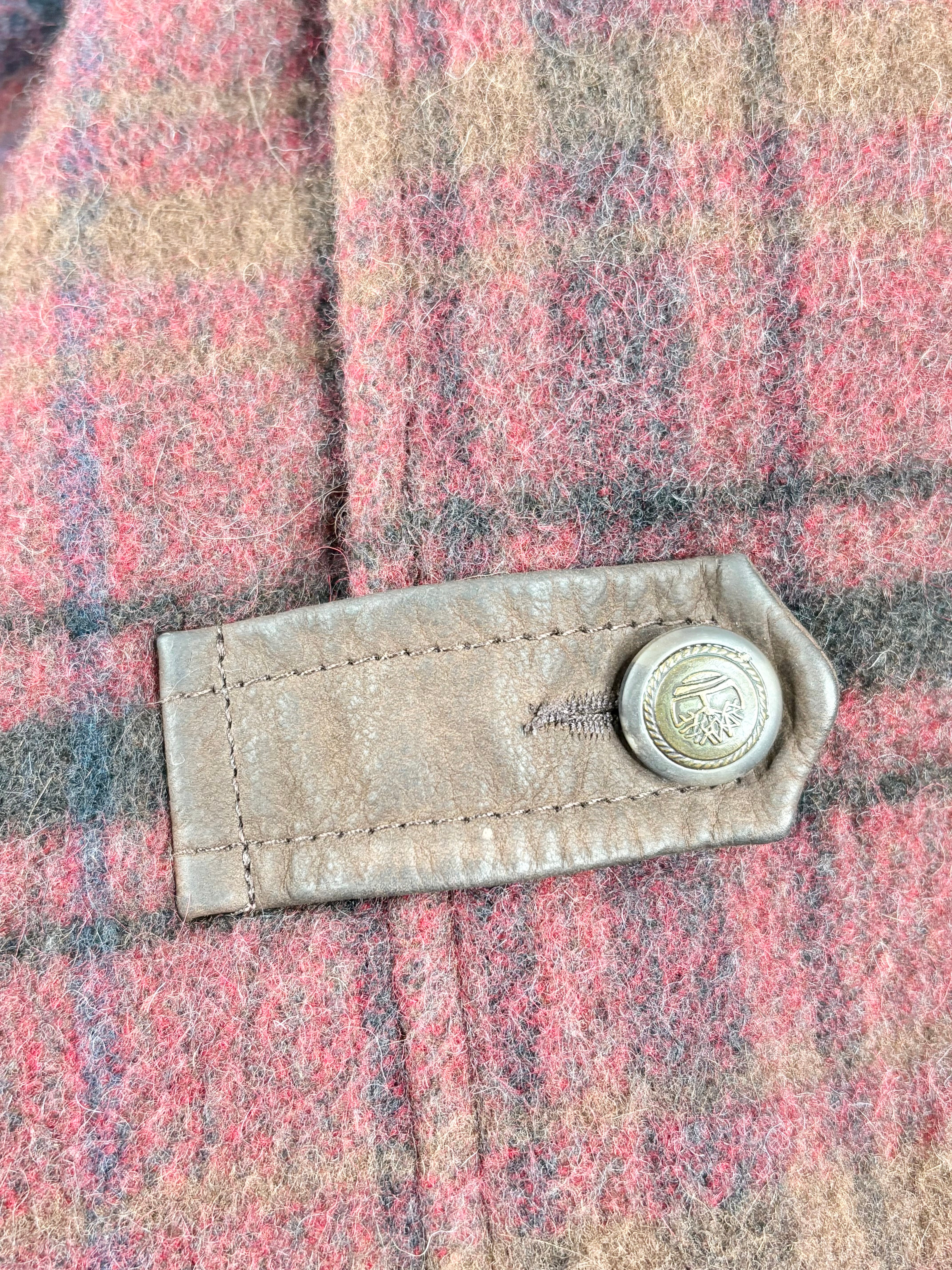 A real winter warmer, is this wool and mohair-blend coat from Timberland. Really embracing that lumbercore vibe with the earthy tones and check pattern. There is some wear as pictured, in the form of fading to the leather details and minor moth holes. Otherwise in overall very good condition on our AU12 mannequin.